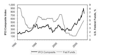 グラフは、1994-1995と1999-2000の米国フェデラル・ファンド利息の増加のあとに、エマージング諸国の株式相場の下落が現れています。