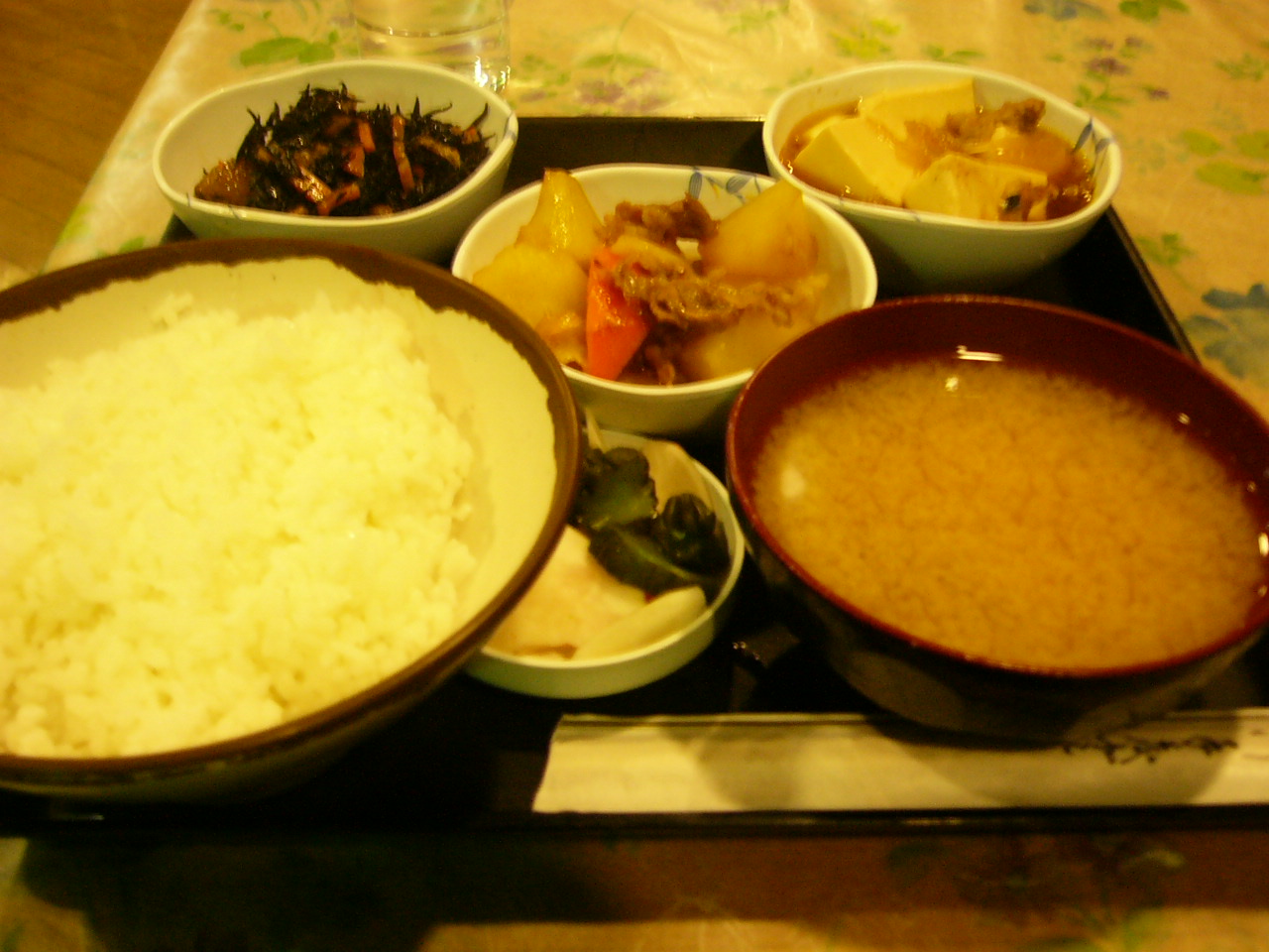 ご飯セット(ご飯と漬物としじみの味噌汁)に、ひじき、すき焼き風煮物、肉じゃがを別に注文して、530円。。。