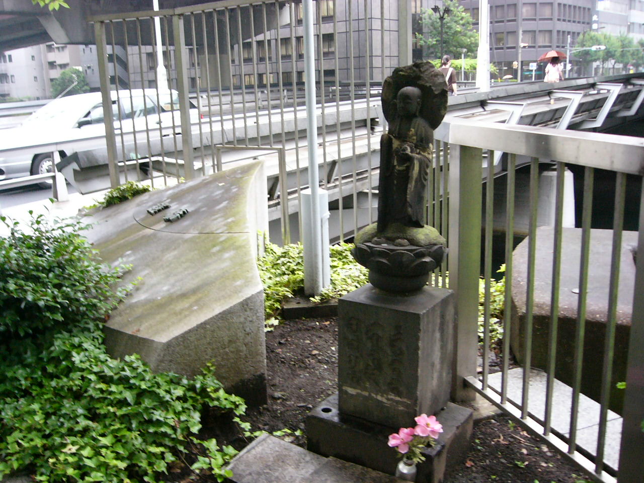 近くの大和証券には、3体の女性の像が立っている中、鎧橋の隅っこにぽつんと小さなお地蔵さんがあります。